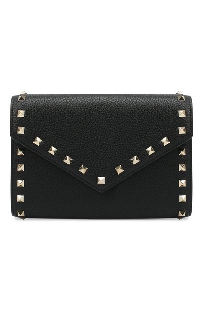 Аксессуары линии Rockstud легко узнать по шипам-пирамидам, вдохновленным заклепками на старинных римских дверях. Есть такой знаковый для марки, основанной Валентино Гаравани, декор и на этой небольшой черной сумке. Для изготовления модели с тонким ремнем-цепочкой выбрали матовую крупнозернистую кожу. Внутри – карман на молнии и 16 слотов для банковских карт.