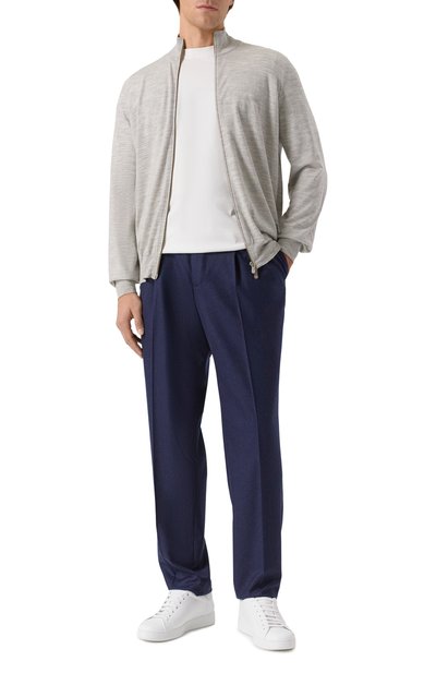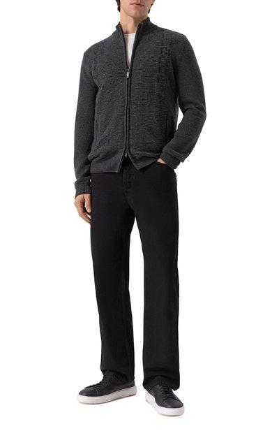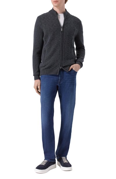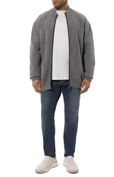 Меланжевый кардиган с контрастными полосами на эластичных манжетах выполнили из кашемирового трикотажа. Модель с высокой горловиной в мелкий руб чик застегивается встречной молнией с брендированными пуллерами.