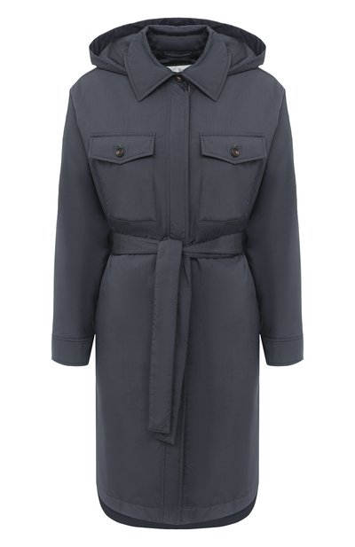 Серое пальто со съемным объемным капюшоном легко справляется с капризами погоды. Мастера марки выполнили модель вручную из плотной матовой ткани, которая не пропускает ветер и не впитывает капли дождя. У изделия из осенне-зимней коллекции Брунелло Кучинелли сформировал свободный крой, но талию можно подчеркнуть поясом.