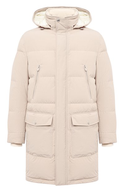 Удлиненный кремовый пуховик из коллекции сезона осень-зима не боится капризов погоды. Гладкий матовый материал не промокает и не продувается, а отборный гусиный пух, равномерно распределенный в стеганых камерах, хорошо держит тепло. На груди — врезные карманы на молниях, по бокам — накладные с клапанами.