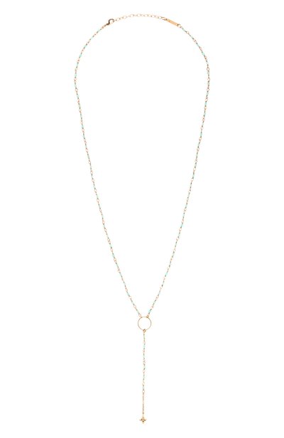 Колье с длинной подвеской будет идеальным вариантом, чтобы подчеркнуть глубокое декольте. Модель выполнили в виде цепочки из ювелирного сплава с гальваническим покрытием золотом, скомбинированной с бусинами из амазонита, а завершили композицию миниатюрной фигурной белью, инкрустированной прозрачным цирконием.