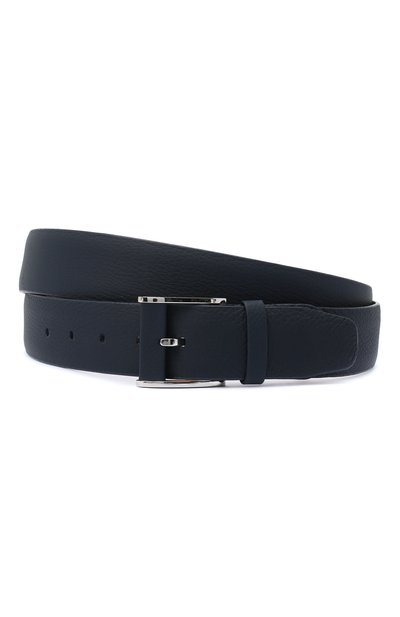 Темно-синий ремень средней ширины будет уместно смотреться и с формальными брюками, и с джинсами. Лаконичность модели из мягкой зерненой кожи не нарушает даже серебристый блеск прямоугольной пряжки: ее частично обтянули таким же эластичным фактурным материалом.