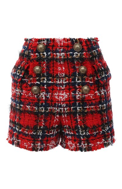 Оливье Рустен включил в межсезонную коллекцию красные шорты. Модель сшили из фактурного твида в клетку тартан. Спереди — знаковые для марки, основанной Пьером Бальманом, пуговицы цвета античного золота. Наши стилисты предлагают составить образ с белой рубашкой, парным жакетом и черными сапогами.