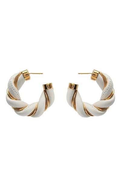В исполнении Дэниела Ли классические серьги-кольца обрели новое звучание. Традиционные обручи сделали витыми и перепели их с белыми шнурами из матовой кожи. Крупный, но при этом легкий аксессуар изготовили из легкого серебра 925 пробы с гальваническим покрытием золотом.