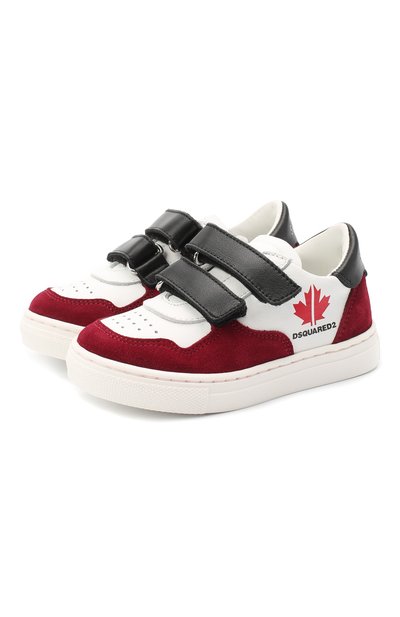 Бордовые кеды с перфорацией на мысе, которая пропускает воздух внутрь, сшиты из матовой гладкой кожи и мягкой бархатистой замши. На союзке — узкие черные ремешки с застежками велькро, регулирующие высоту в подъеме. Сбоку — логотип марки.
