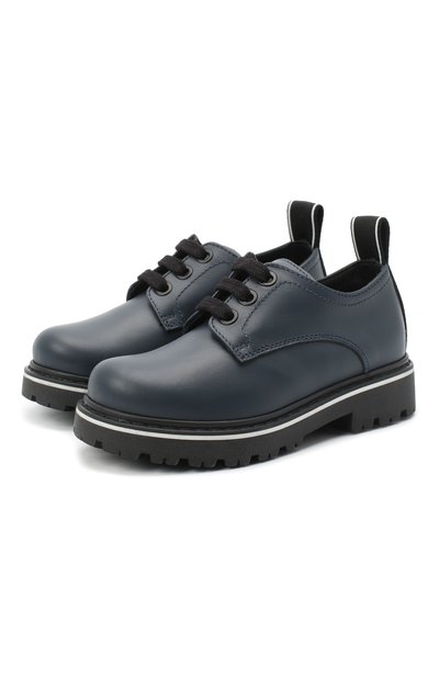 Несмотря на темно-синий цвет и лаконичный силуэт эти дерби из мелкозернистой матовой кожи выглядят расслабленно. За неформальный характер отвечает широкая рифленая подошва с белой полосой и брендированная текстильная петля на заднике.