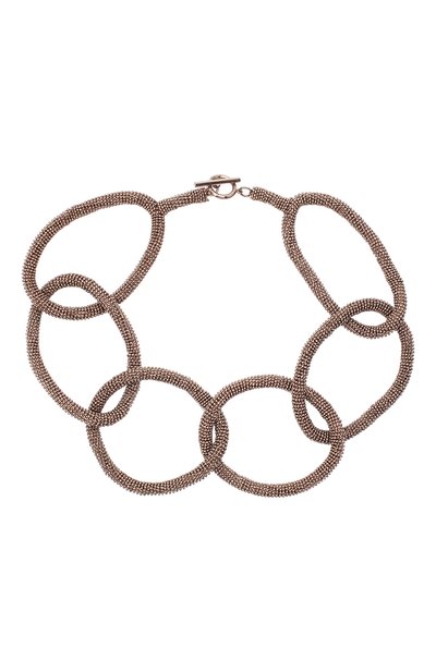 Крупные звенья этого колье выполнили из знаковых цепочек мониль, составленных из латунного бисера, который деликатно мерцает в движении, отражая свет всеми гранями. Такое украшение привыкло солировать в образе, поэтому рекомендуем собрать волосы в прическу и отказаться от массивных серег.