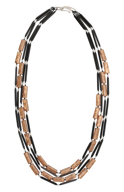 Многоярусное колье поддержит даже самый простой комплект. За правильное настроение отвечает сдержанная цветовая гамма: аксессуар составили из множества фигурных черных, темно-бежевых и прозрачных элементов. Детали выполнили из эпоксидной смолы, а основу — из легкого ювелирного сплава.