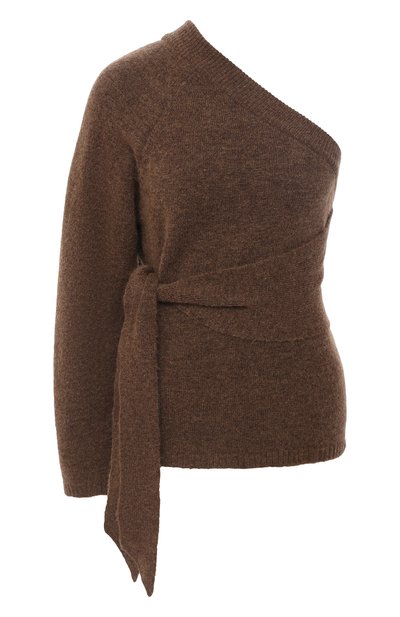 Свитер из осенне-зимней коллекции будет хорошей инвестицией в базовый гардероб. Асимметричный крой с открытым плечом позволяет ему выделиться на фоне других лаконичных моделей, а кофейный цвет помогает все так же рифмоваться с любыми вещами. Мастера марки связали и зделие из мягкой пушистой пряжи на основе тонкой шерсти. Финальный аккорд поставили широким поясом на талии.