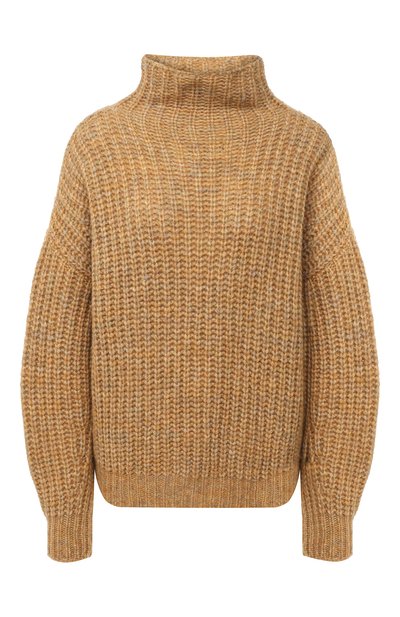Свободный горчично-желтый свитер с воротником-стойкой выполнили фактурной вязкой из объемной меланжевой пряжи на основе мягкой шерсти и нежного пуха ангорских коз. Одежда из такого материала не пилингуется, хорошо удерживает тепло и не колется, даже если носить ее на голое тело. Изабель Маран включила свитер в осенне-зимнюю коллекцию.