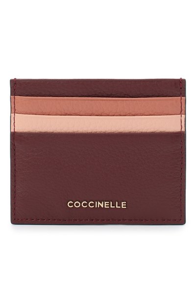 Мастера марки сшили картхолдер из отрезов мягкой зернистой кожи бордового, карамельного и нюдового цветов. Единственный декор футляра — рельефный металлический логотип бренда спереди. Аксессуар с шестью слотами для кредитных карт дополнен карманом для чеков.