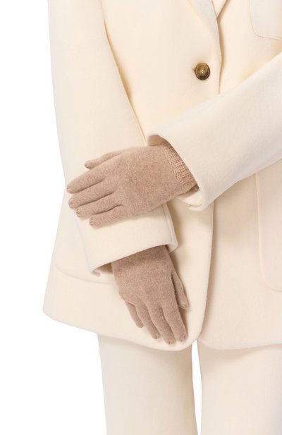 Бежевые тонкие перчатки с узкой фактурной манжетой связали из мягкого легкого кашемира. Приятный на ощупь материал поддерживает комфортную для рук температуру даже в небольшие морозы. Аксессуар дополнили имитацией раструба и подчеркнули эту деталь золотистыми знаковыми цепочками мониль.