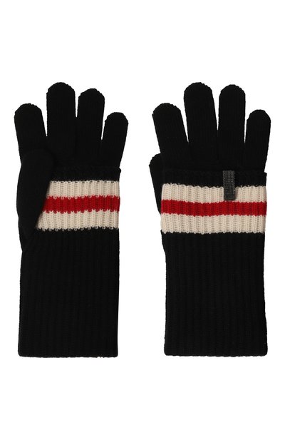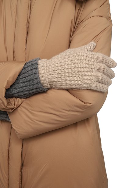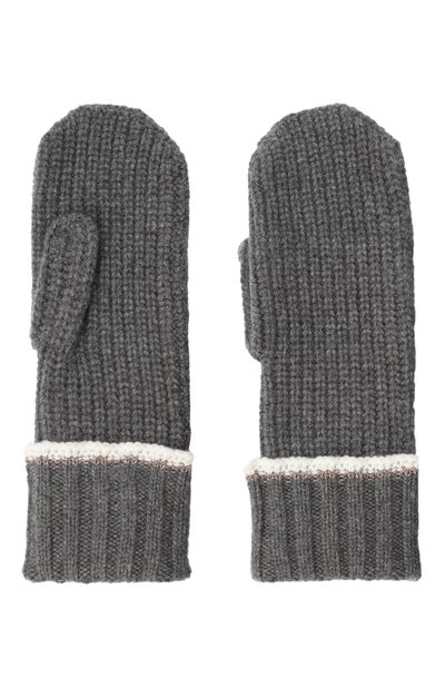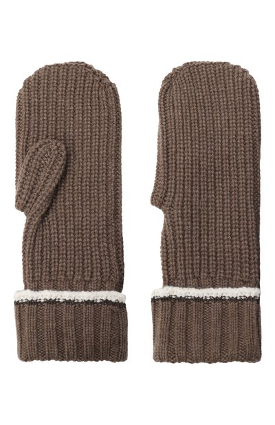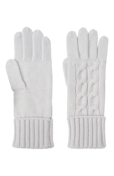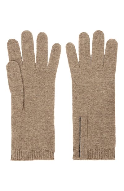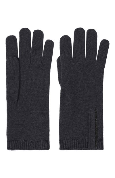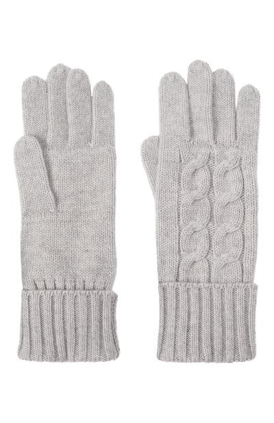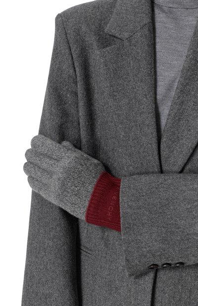 Меланжевые перчатки связали из тонкой пряжи на основе чистого кашемира. Аксессуар с эластичной манжетой декорировали узкой накладкой в тон и фирменной цепочкой мониль.