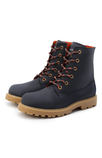 Ботинки сшили из плотной кожи с матовой поверхностью, а внутри отделали ворсистой шерстью, обеспечивающей комфорт в прохладную погоду. Чтобы пару было удобно надевать и снимать, помимо шнуровки предусмотрели молнию с ремешком на кнопке.