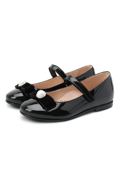 Мастера марки изготовили черные балетки из мягкой лакированной кожи с глянцевым блеском. За удобную посадку отвечает узкий ремешок велькро, а за комфорт при ходьбе – анатомическая стелька. Мыс декорировали бархатным бантом с крупным перламутровым кабошоном.