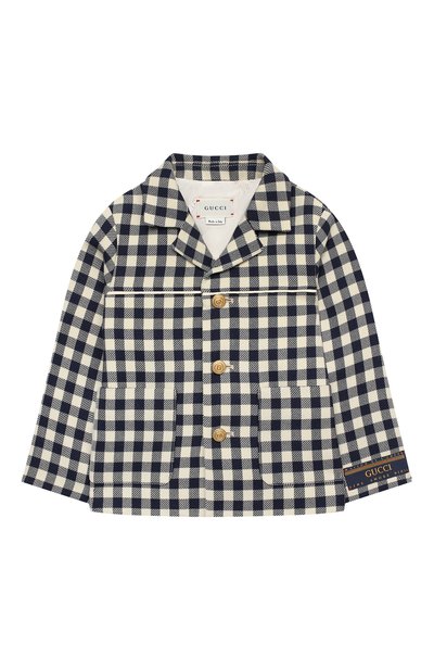 Команда марки создала несколько вещей в сотрудничестве с коллекционером винтажной детской одежды Анжелой Линн. В их числе — синий клетчатый пиджак с широкими лацканами и накладными карманами. Для пошива модели использовали мягкую шерсть, которая за счет природных свойств поддерживает оптимальную для тела температуру. На рукаве — архивная нашивка с логотипом бренда.