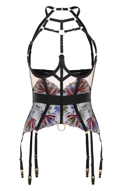 Для изготовления корсета использовали черный атлас с характерным блеском. Дизайнеры марки декорировали изделие вставками из переработанного полупрозрачного тюля, который вручную расшили цветочными узорами. Фурнитуру традиционно покрыли тонким слоем 24-каратного золота.