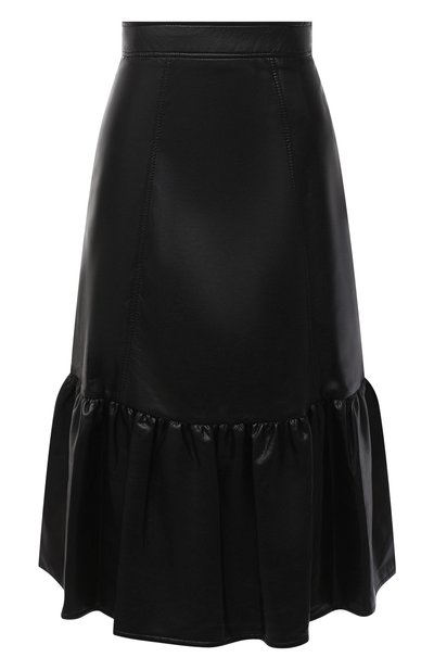 Лоренцо Серафини соединил в черн ой юбке из осенне-зимней коллекции бунтарство и романтичность. За первое отвечает материал. Модель сшили из глянцевой эко-наппы на основе вискозы, но при этом украсили ее широкой оборкой. Наши стилисты рекомендуют продолжить идею в образе и сочетать вещь с нарядной блузой и казаками.