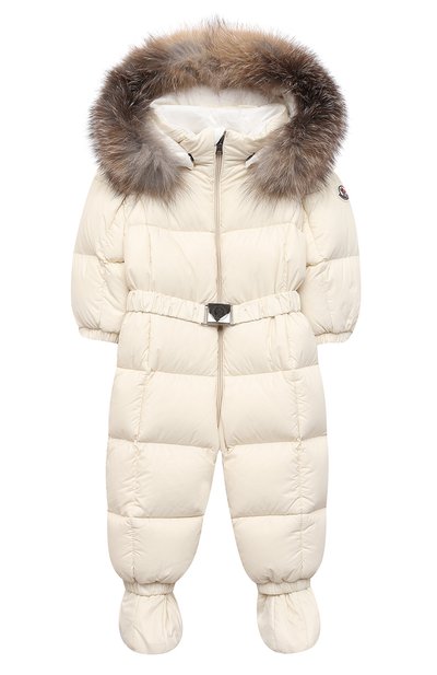 Мастера марки сшили светло-бежевый стеганый комбинезон из прочного нейлона, который защищает от дождя и ветра, а дополнительный комфорт обеспечивает хлопковая трикотажная подкладка. За поддержание оптимальной температуры отвечает легкий наполнитель из отборных гусиных пуха и пера. Чтобы внутрь не задувало, манжеты на рукавах и брючинах дополнили резинками. И объемный капюшон, и пинетки можно снимать.