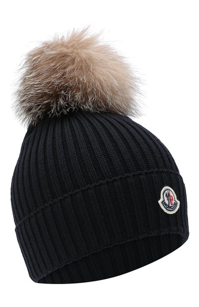 Темно-синяя эластичная шапка с пушистым помпоном из меха песца связана из мягкой шерстяной пряжи. Ее волокна не раздражают кожу, а сам аксессуар хорошо держит тепло, не вытягивается и не пилингуется. На широком отвороте — фетровая апп ликация с логотипом марки.