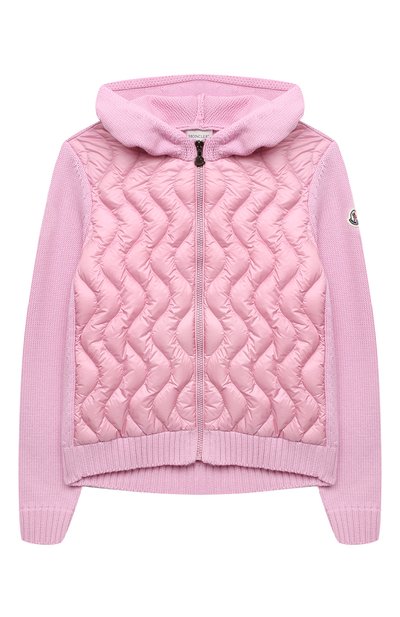 Розовый кардиган выглядит так, словно поверх толстовки с капюшоном надели жилет со стеганым волнообразным узором. В модели действительно сочетается функционал такого комплекта. Все потому что вещь связали из пряжи, созданной из нежной шерсти virgin. А для вставки, утепленной отборными гусиными пухом и пером, выбрали непромокаемый нейлон.