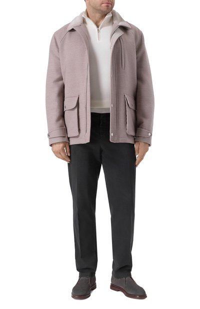 Куртку с потайным поясом-кулиской и штормовым клапаном, скрывающим молнию, сшили из фактурной кашемировой ткани. Модель с воротником-стойкой и съемным капюшоном утеплили материалом Thermore® 60 HL. Изделие с двумя прорезными и парой накладных карманов с двумя входами дополнили двумя внутренними карманами.