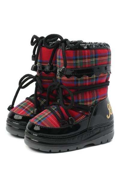 В представленных эксклюзивно в ЦУМе сапогах будет комфортно в непогожий зимний день. Прочная клетчатая ткань в сочетании с нашивками из гладкого, похожего на лакову ю кожу материала не промокает, а внутренняя отделка из фактурной шерсти поддерживает оптимальную для ног температуру. Кулиска на голенище не дает снегу попасть внутрь, а шнуровка на подъеме регулирует посадку.