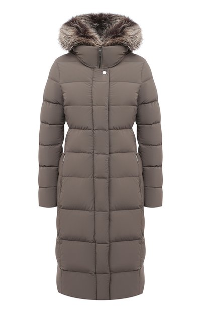Пуховик сшили из матового гладкого нейлона цвета хаки. Однотонная модель из коллекции сезона осень-зима подойдет для прогулок в морозную погоду. За тепло отвечает плотный слой гусиного пуха и пера, равномерно распределенного в стеганых камерах. Объемный капюшон дополнили съемной вставкой с мехом енота.