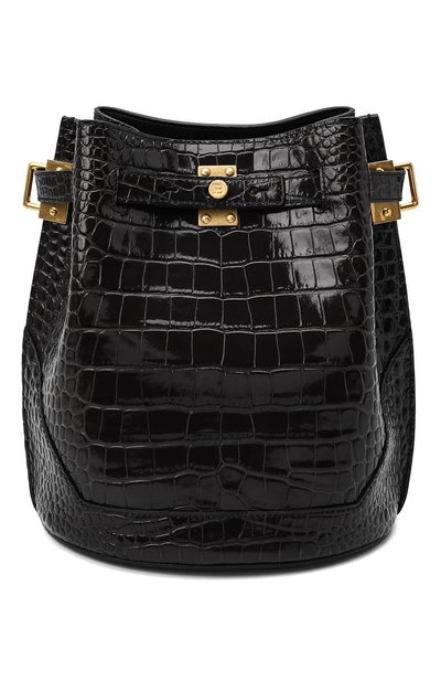 Черная сумка B-Belted из осенне-зимней коллекции бренда, основанного Пьером Бальманом, – аксессуар 2-в-1: благодаря широким съемным ремням ее можно носить и на плече, и как рюкзак. Для изготовления модели Оливье Рустен выбрал мягкую лакированную кожу с тиснением под крокодила. В изделие, которое затягивается, как мешок, поместятся планшет, кошелек и ключи.