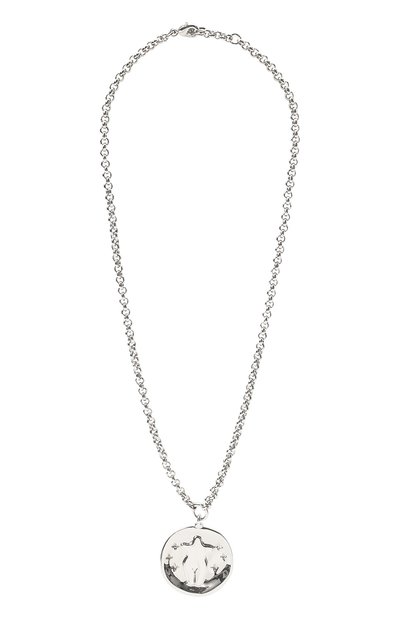 Мастера марки выполнили тонкое колье из прочного ювелирного сплава с гальваническим палладиевым покрытием. Цепочку ажурного плетения дополнили круглой полированной подвеской с выгравированным мотивом, вдохновленным древними символами плодородия.