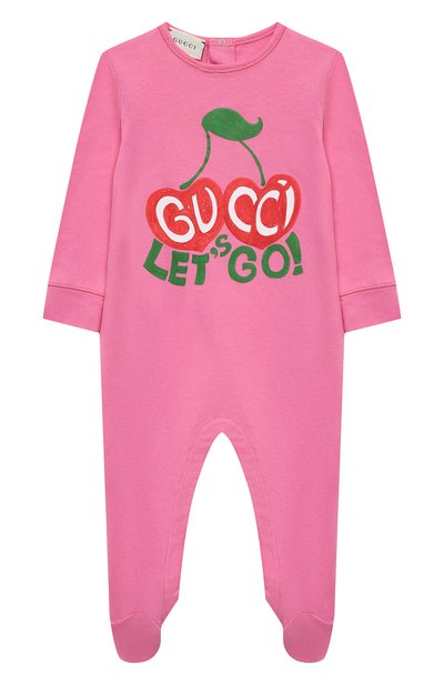 Розовый цвет для комбинезона с круглой горловиной дизайнер марки позаимствовал у клубничного суфле. Модель с ярким принтом в виде вишен и логотипа бренда выполнили из мягкого гипоаллергенного хлопка. Этот приятный на ощупь материал быстро впитывает влагу и не сковывает движе ния за счет эластичной структуры.