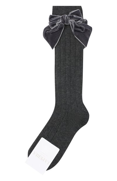 Для изготовления серых гольфов мастера марки использовали мягкий хлопковый трикотаж. Чтобы изделия комфортно облегали ноги и не растягивались, в состав пряжи добавили стрейчевые волокна и прочный полиамид. Большие бархатные банты на манжетах задают модели праздничное настроение.