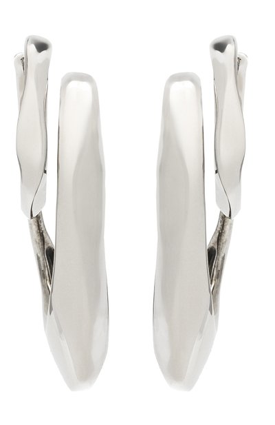 Несмотря на лаконичный внешний вид серьги умеют быть в центре внимания. Выразительным украшение сделала замысловатая форма, будто позаимствованная у экспонатов на выставке современного искусства. Для изготовления модели использовали полированную латунь с гальваническим покрытием серебром.