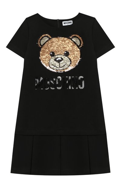 Для пошива черного платья с короткими рукавами мастера марки использовали мягкий вискозный трикотаж с волокнами нейлона и эластана в составе. Спереди — глянцевый логотип бренда в тон и вышитый мерцающими пайетками мотив в виде фирменного медведя. Модель застегивается скрытой молнией сзади.