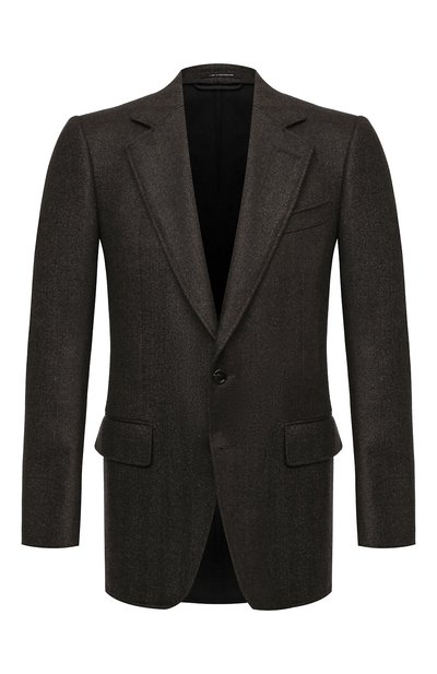 Коричневый однобортный пиджак из осенне-зимней коллекции – идеальный вариант для создания повседневных образов и комплектов в стиле smart casual. Например, наши стилисты предлагают носить с футболкой, кардиганом, джинсами и дерби. Для пошива модели Том Форд выбрал плотный шерстяной твид с шевронным мотивом. Широкие лацканы дополнили петлей из матовой кожи.