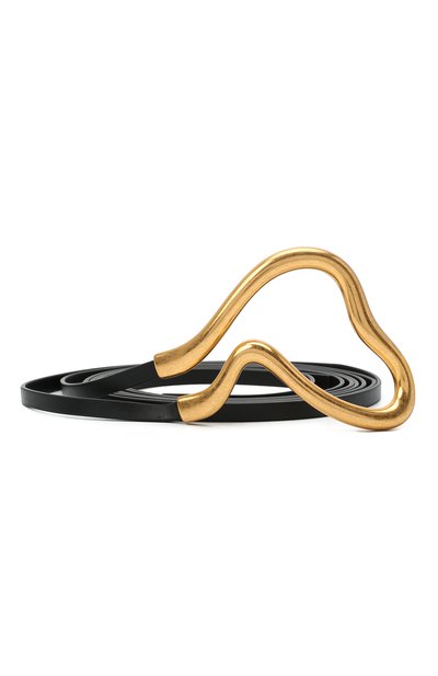 Черный ремень может стать акцентной деталью образа, составленного из однотонных вещей. Нестандартный аксессуар с двумя узкими, гипертрофированно длинными лентами выполнили из мягкой эластичной кожи наппа. Они завязываются узлом на золотистой фигурной пряжке, форму для которой словно позаимствовали у скульптур современного искусства.