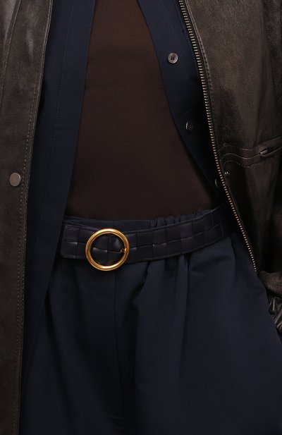 Черный ремень из двух длинных лент можно носить как поверх классического пиджака, чтобы подчеркнуть талию, так и продев в шлевки джинсов. Главную роль в изделии из мягкой кожи наппа отдали фурнитуре: фигурная пряжка с золотистым гальваническим напылением выглядит как завязанная жгутом петля.