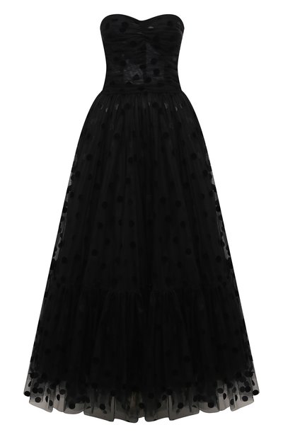 Черное платье из осенне-зимней коллекции — квинтэссенция женственности. Доменико Дольче и Стефано Габбана собрали в одной модели открытые зону декольте и линию плеч, мягкую драпировку и пышный многослойный подол. Для пошива изделия использовали тонкий тюль с мотивом в крупный горох. Предлагаем завершить образ босоножками цвета фуксии и миниатюрной однотонной сумкой.