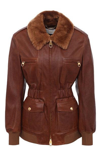 Терракотовая куртка из осенне-зимней коллекции стилизована под одежду пилотов, но выглядит при этом максимально женственно: приталенный крой формирует силуэт «песочные часы» и позволяет модели подстраиваться под образы разной сложности. Для пошива изделия с трикотажными поясом и манжетами, как у бомбера, использовали пластичную матовую кожу наппа. Отложной пушистый воротник дополнительно защитит шею от ветра.