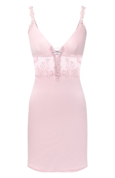 Сорочка из мягкого шелковистого на ощупь модала выглядит максимально романтично за счет нежного розового оттенка и полупрозрачных вставок из тонкого цветочного кружева. За идеальную посадку отвечают узкие регулируемые бретели.