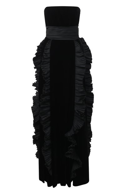 На создание межсезонной коллекции Зухэира Мурада вдохновил стиль ар-деко 1920-х годов. Это отразилось в выборе материалов и декора для черного платья-бюстье. Модель сшили из мягкого бархата с благородным блеском. Отрезной расклешенный подол сделали объемнее ниспадающими плиссированными оборками, словно выполненными из гофрированной бумаги.