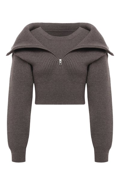 В коллекции сезона осень-зима Симон Порт Жакмюс представил свою версию повседневного свитера. Работая над коричневой моделью, дизайнер сформировал эффект многослойности. Если расстегнуть молнию, кажется, что вещь надели поверх пуловера в тон. Укороченное изделие связали из мягкой шерстяной пряжи. За счет узора английская резинка одежда хорошо тянется в ширину, не стесняя движения.
