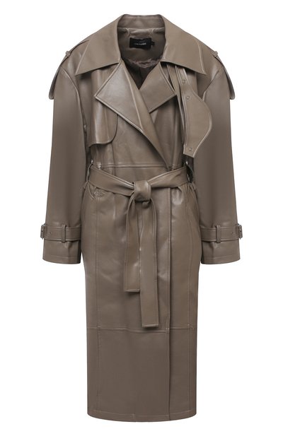 Тренч цвета хаки, с погонами, отлетными кокетками и двумя врезными карманами сшит из гладкой пластичной кожи с матовым блеском. Силуэт формирует широкий пояс-лента. Однотонная модель с запахом, вошедшая в коллекцию сезона осень-зима, подружится с любыми вещами.