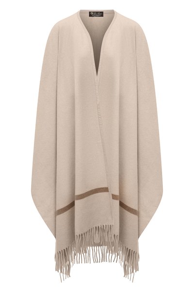 Дизайнеры марки, основанной Пьетро Лоро Пьяна, вывели накидку из осенне-зимней коллекции на новый уровень с помощью материала. Свободную модель оттенка латте выполнили из нежного, почти невесомого baby-кашемира, который бережно вычесали из подпушка молочных козлят. Каждое животное дает настолько тонкие, длинные и теплые волокна только раз в жизни, что делает вещь с бахромой поистине драгоценной.