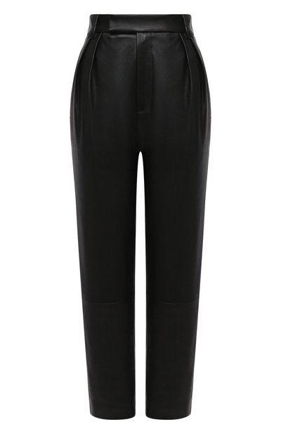 Для пошива черных брюк, представленных на показе коллекции сезона осень-зима, использовали мягкую матовую кожу, которая благодаря тонкой выделке слегка тянется, не сковывая движения. Завышенная посадка и защипы на поясе, формирующие объемные складки, помогают подчеркнуть талию.