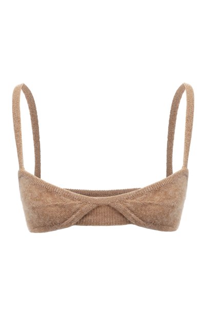 Мастера марки выполнили бежевый кроп-топ, стилизованный под бра, из тонкого нежного кашемира. Сырье для создания пряжи получают из вычесанного и промытого вручную пуха горных коз, поэтому материал получается очень легким и практически не ощущается на теле.