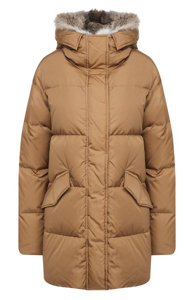 Кор ичневый пуховик станет удачным выбором для долгих прогулок в морозы. Для изготовления модели из осенне-зимней коллекции Беттина Лемпелиус выбрала прочный нейлон. Обработанный водоотталкивающей пропиткой материал защищает от ветра и влаги, а отборный пух поддерживает оптимальную для тела температуру, не утяжеляя стеганое пальто. Объемный капюшон дополнили съемной отделкой из пушистого меха кролика.