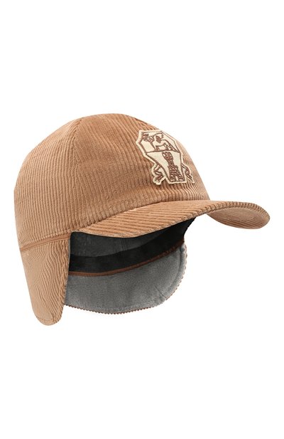 Бежевая бейсболка из плотного хлопкового вельвета может стать хорошей альтернативой осенней шапке. Аксессуар с широкими наушниками и жестким изогнутым козырьком отделан внутри мягким джерси. Спереди — крупный патч с логотипом марки.