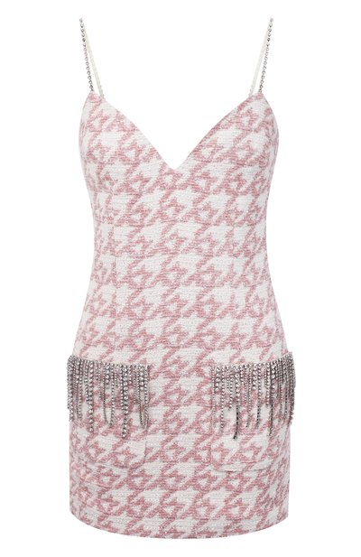 Для пошива светло-розового короткого платья из коллекции сезона осень-зима использовали мягкий твид с узором гусиная лапка. Роль декора взяли на себя миниатюрные сверкающие кристаллы. Из них сложили узкие цепочки, которыми обозначили бретельки и подол. Глубокий фигурный вырез акцентирует внимание на декольте, а открытая часть спины сформирует привычку демонстрировать правильную осанку.