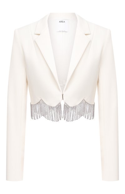 Универсальный белый цвет и четкие линии кроя не мешают жакету из коллекции сезона осень-зима выглядеть эффектно. Выразительной модель делает укороченная длина и отделка — каскад из узких цепочек, инкрустированных сверкающими кристаллами. Изделие сшили из прочного матового материала, в котором скомбинировали полиэстер, шерсть и эластан.